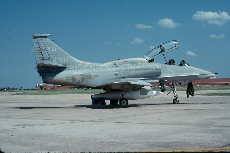 Unit Photos 1975: HMS-13 Skyhawks BuNo 153459, YU-5, BuNo 154633, YU-4, BuNo 154652, YU-3 and BuNo 154624, YU-2, as they pass by one of the channel islands. Harry Gann>. 15 July 1975: HMS-13 Skyhawk BuNo 153459, YU-5. U.S. Navy photo by Cpl. Quinn. 1976: left to right: HMS-13 Skyhawks BuNo 153459, 154331, 154623, 154651; 154328, YU-6. Harry Gann. APR 1977: HMS-13 Skyhawk BuNo 152877, YU-2, parked on the ramp in front of the Mountain Home AFB welcome sign. Rob Mignard. 09 NOV 1977: HMS-13 154331, YU-01, at Kirtland AFB. J.A. Sheets. Date unknown: OA-4M, BuNo 154335 of HMS-13. A-4F in the background is 154194 (ME-03) of VMA-133. Photographer & location unknown. 1978: H&MS-13 Skyhawk BuNo 154331, YU-01, in formation with BuNo 154633, YU-4 in the foreground and BuNo 154623 & BuNo 154651 in the background. Unknown photographer via W. Mutza. OCT78: BuNo 153459, YU-5, parked on the ramp with external power hooked up. Gary Verver Collection. NOV79: BuNo 15624, MALS-13, shortly after conversion to OA-4M configuration. Gary Verver Collection. 1979: BuNo 154622, YU-07, with someone peeking into the forward Hell Hole. Gary Verver Collection. 30 Aug 1980: BuNo 153531, YU-8, parked on the Andrews ramp. Photo by E. Zorn via Scott Van Aken. OA-4M of H&MS-13, BuNo 153531, sits on the ramp. AUG81: BuNo 154307, OA-4M, on the ramp with what looks like flight gear hanging on the nose gear door. Gary Verver Collection. Photo dated Mar 1990: Last TA-4F Skyhawk aircraft (BuNo 154633) to be received by this Marine Corps Air Station. U.S. Navy photo by Msgt Grindstaff. 19MAR80: Low angle front view of TA-4F Skyhawk aircraft BuNo 154633. U.S. Navy photo by Msgt Grindstaff. 19MAR80: Port side rear view of the last TA-4F Skyhawk aircraft (BuNo 154633) to be received by this Marine Corps Air Station. The A-4 is a "work horse" used by the infantry for many close air support missions. U.S. Navy photo by Msgt Grindstaff. 06 Jan 1982: BuNo 154623 taxiing on a snow covered taxiway. Photo by Joe Cupido, G. Verver collection. Jun 1980: BuNo 154335 parked on the flight line. Gary Verver Collection. 1980: BuNo 154623 parked on the ramp with a variety of other a/c. Gary Verver Collection. 19 MAR 1981: OA-4M Skyhawk BuNo 154333 parked on the MCAS El Toro flight line. The aircraft is equipped with a tanker package. U.S. Navy photo by Msgt Grindstaff. 1982: BuNo 154328, YU-xx on the ramp. This is an OA-4M, and the image is from Gary Verver. 1982: BuNo 154630, YU-xx on the ramp. Another OA-4M from Gary Verver Collection. DEC82 BuNo 154630, tail code YU-2, parked on El Toro ramp. Gary Verver Collection. JUN83 BuNo 154623, YU-000, assigned to MGEN J.M. Batis parked on the ramp. Gary Verver Collection. OCT85: H&MS-13 Skyhawk BuNo 153529, YU-00, comes in for a landing. R.E. Arance. MAY86: H&MS-12 TA-4F BuNo 153488, WA-00, MAY 1986. Name below the canopy is p/c LCpl Tuttle. Photographer unknown, from Gary Verver Collection. 08MAY87: OA-4M BuNO 154630 Marine "Observation" Aircraft - aka "Fast FAC". On the nose wheel door is Plane Captain LCpl RL Baker's name. Photographer Unknown. 1987: BuNo 154630, OA-4M, H&MS-13 of NAS El-Toro. Gary Verver Collection. Off-Duty Photos No info yet. |