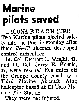 Events October 20, 1969: LCol. Herbert L. Wright, 41, and Lt. Col. Jerry E. Kehrle, 37, ejected safely and were rescued five miles off the Orange County coast Monday after their TA-4F (BuNo 154625) developed control difficulties. Redlands Daily Facts, Tuesday, Oct. 21, 1969. July 3, 1970: Capt. Stephen R. McComb, 27, and 1st Lt James P. Schwartz, 25, both stationed at MCAS El Toro, ejected safely Friday when their TA-4F (BuNo 154644) crashed 30 miles northwest of Crystal Springs enroute from NAS Alameda to Buckley ANG Base in Colorado. Nevada State Journal, Saturday, July 4, 1970. |