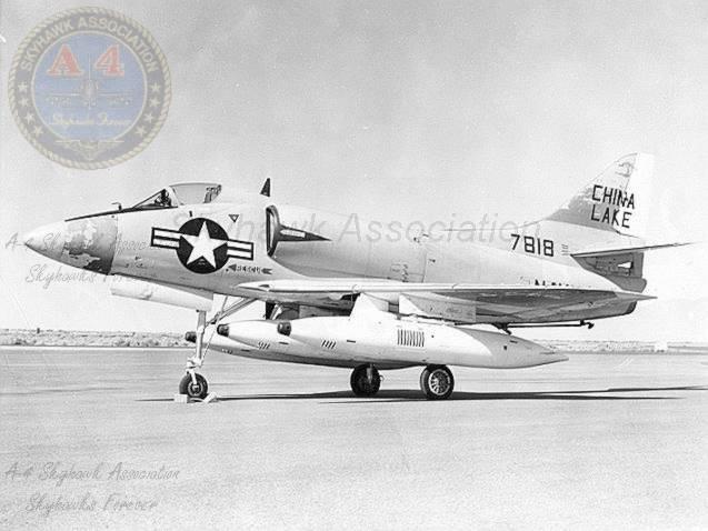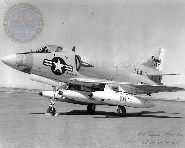 01MAR62: China Lake Skyhawk BuNo 137818 on the ramp with a GLADEYE dispenser on the centerline. Pic2. Navy Photos.