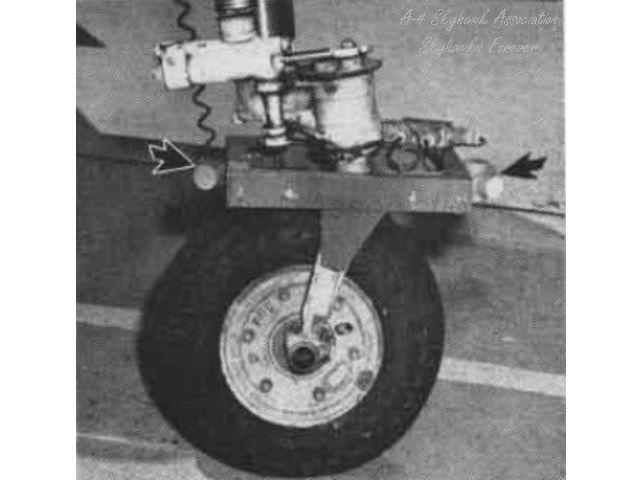 Circa 1963: Naval Air Testing Facility Skyhawk BuNo 137819 as AN R. Howey demonstrates this Scooters ability to taxi unaided along an electronic guide-way. BuNo 137819 close-up of the nose wheel pick-up coils that allow this Scooter to taxi un-aided along an electronic guide-way. Naval Aviation News photo.