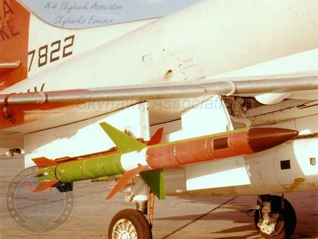Date Unknown: A view of an AGM-45A Shrike surface attack anti-radar missile mounted on the wing pylon of China Lake A-4C BuNo 147680. Photographer unknown, from Gary Verver.