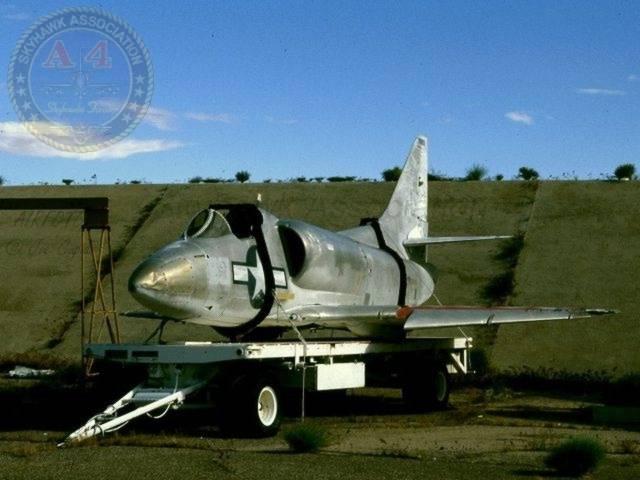 JUN98: Skyhawk BuNo 144976 on a trailer in the SNORT aircraft compound at China Lake. AITFOTO, © Joe Cupido.