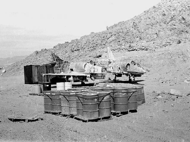 FEB 1996: 142892 at the China Lake WSL firefighting area. A-4B BuNo 142892 in the foreground & 142946 in the background after a stint in the fire pit at China Lake. AIRFOTO © Joe Cupido. Skeleton of 142892.