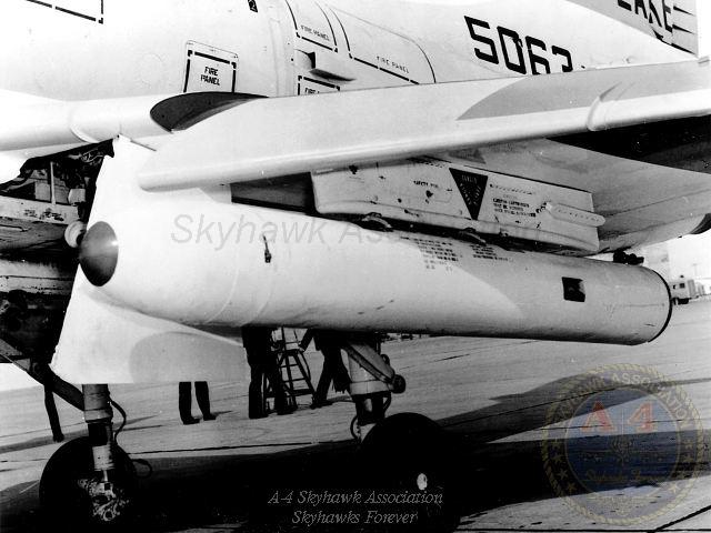 12JUN62: China Lake Skyhawk BuNo 137818 close-up of the GLADEYE chaff, leaflets or antipersonnel ordnance dispenser on the centerline station. China Lake Skyhawk BuNo 137818 close-up of the GLADEYE chaff, leaflets or antipersonnel ordnance dispenser on the centerline station. Unknown photographer from R. Summers collection.