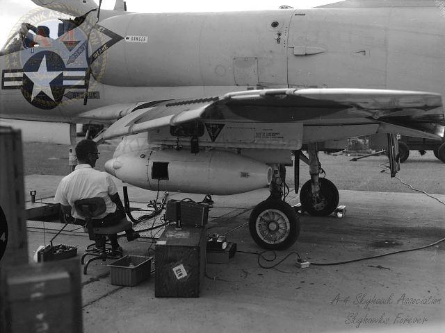 Circa 1963: China Lake NA-4C BuNo 145063, HIPEG gun pods. "I was the plane captain for both HIPEG aircraft (137818 and 145063) in 1963 and never walked in front of them after I was told the HIPEGs occasionally fired with no-one in the cockpit. Think they were pulling my leg, but things like that did happen from time to time. Pretty impressive when they all cut loose as each pod fired 66 rounds of 20mm per second." Gary Verver. Official U.S. Navy from Gary Verver Collection.