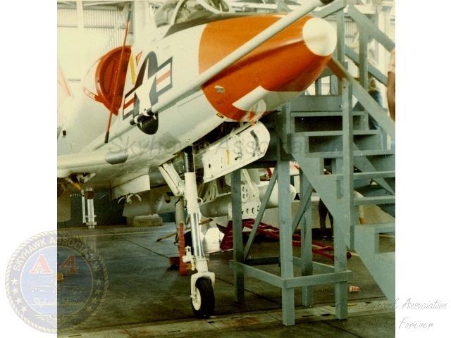 02OCT78: Close-up left front view of China Lake Skyhawk BuNo 153677 parked in hangar #3 with a SSS pod on the center line. Closer close-up. Official U.S. Navy photo, G. Verver collection.