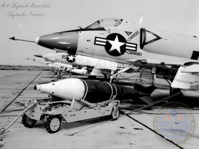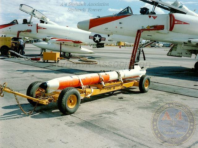 07JUN1963: A-4B 144925 on the China Lake hot line with three Sadeye cluster bombs. Close-up of the Sadeye cluster bomb. Navy photos.