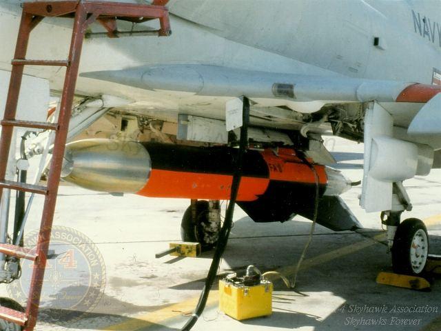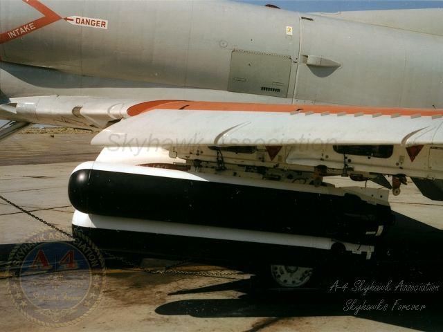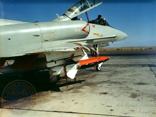 JUN80: Right front view of China Lake Skyhawk BuNo 160245, with AGM-65E Maverick missiles. Pilot is USMC MAJ John Bland. Photo via LCDR Rick Burgess, USN Retd.
