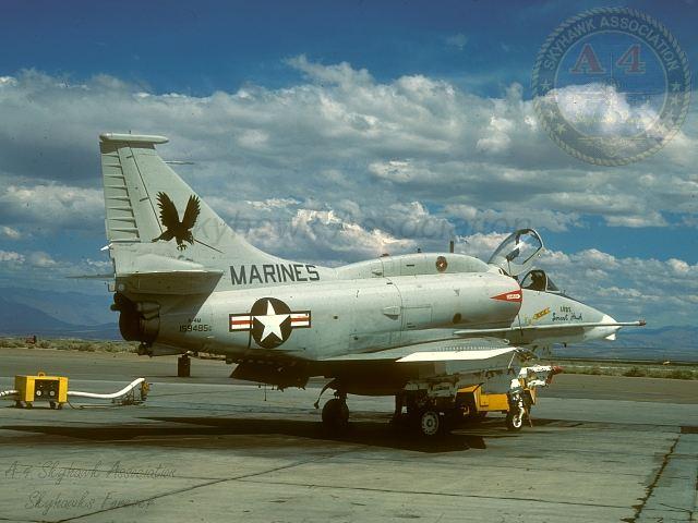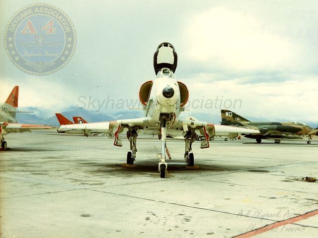 APR84: Left front view of China Lake Skyhawk BuNo 154332, parked on the ramp west of hangar #3. Photo by J. Jacobs via Tailhook Association.