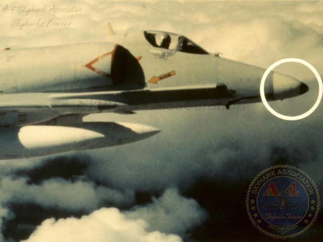 JUN81: NWC China Lake TA-4F Skyhawk BuNo 154332 with HARM seeker nose in-flight.