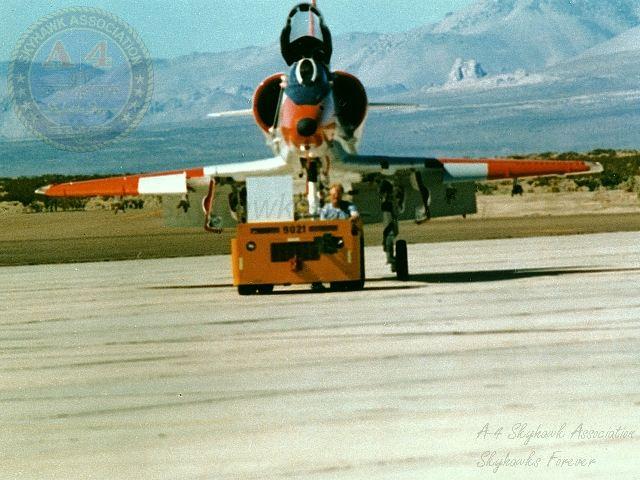 05AUG80: Head-on view of China Lake Skyhawk BuNo 152101 and tug. Navy photo.