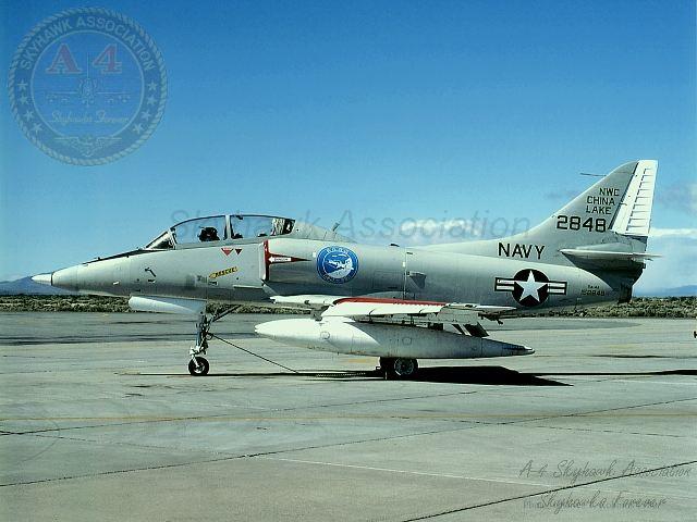 24NOV84: China Lake Skyhawk BuNo 152848 on the flight line in low vis gray and the NWC screaming eagle insignia on the tail. China Lake Skyhawk BuNo 152848 on the flight line in low vis gray and the NWC screaming eagle insignia on the tail. Photo by J. Handelman, G. Verver collection.