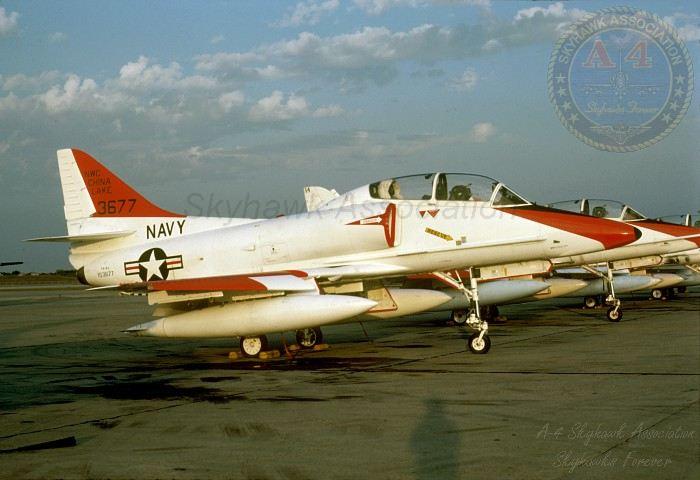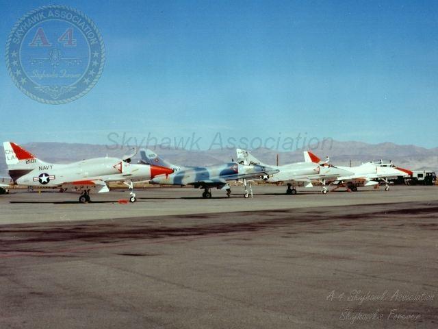 08NOV79: China Lake Skyhawk BuNo 152101, Top Gun BuNo 150044, #555, China Lake BuNo 154172 China Lake BuNo 153677 parked on the Hot Line. Navy photo.