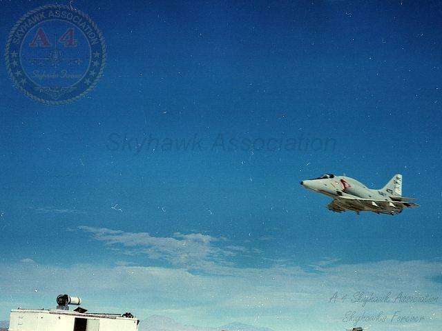 05NOV79: Left front in flight view of China Lake Skyhawk BuNo 154172, Phoenix flyover. Navy photo.