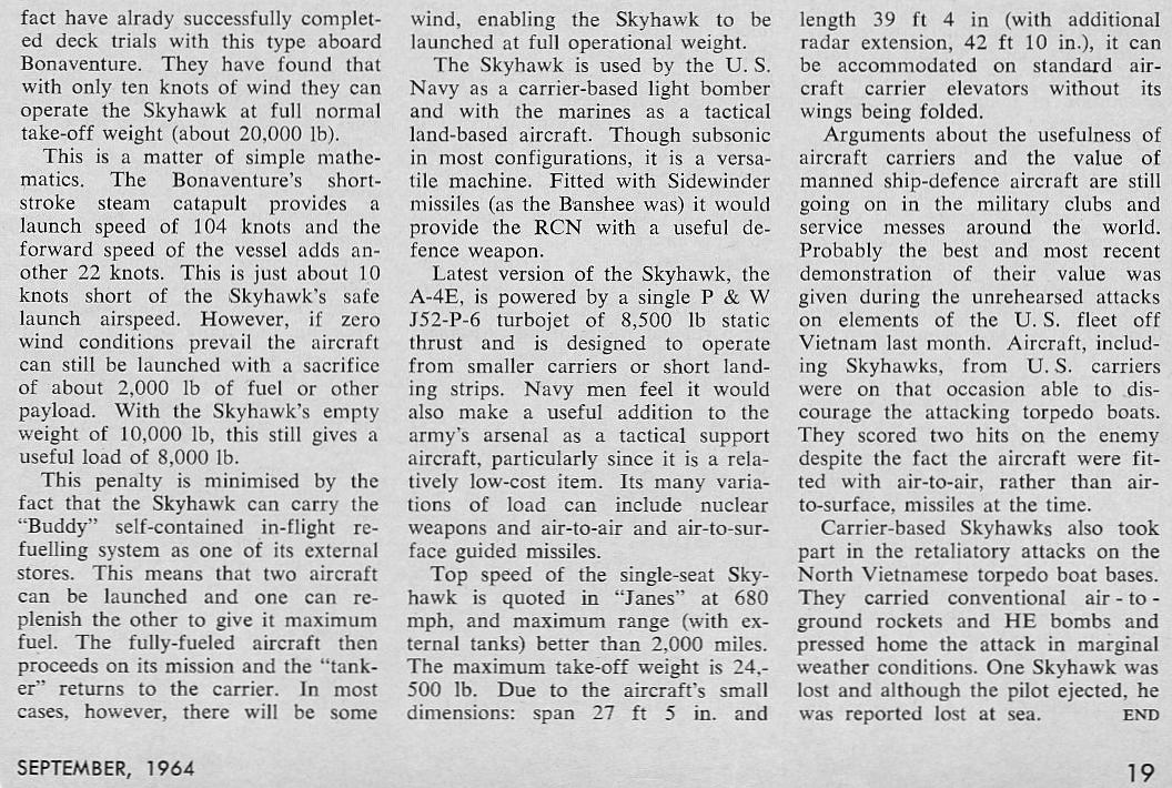 "After leaving Cyprus, the ship began to operate aircraft enroute Norfolk, Virginia with brief stops at Malta and Gibraltar. Canada, at this time, was interested in a replacement for the F2H-3 BANSHEEs and were looking at the Douglas A4E SKYHAWK and the Ling-Temco-Vought A-7 CORSAIR II with a minor modification was useable. The Douglas/USN people hoped that they could also sell the A4E to the Indian Navy but after flight deck trials, landing trials etc all of which were most successful and despite the fact that BONAVENTURE could have carried and operated 25 of these aircraft no purchase was made of the A4E. But the Royal Australian Navy (RAN) bought and successfully operated A4E’s off a sister ship of the BONAVENTURE. (The Canadian Armed Forces later had an opportunity to buy A4E’s but opted to build the Northrop/Canadair CF 5A/B in Canada instead)."
