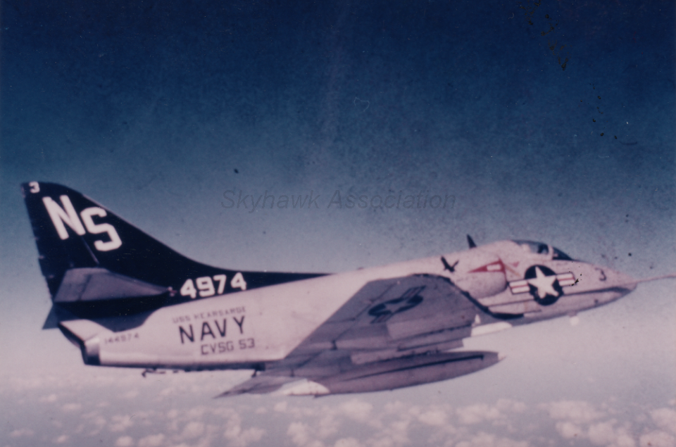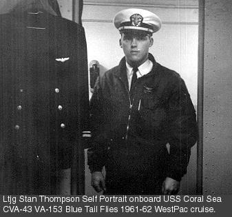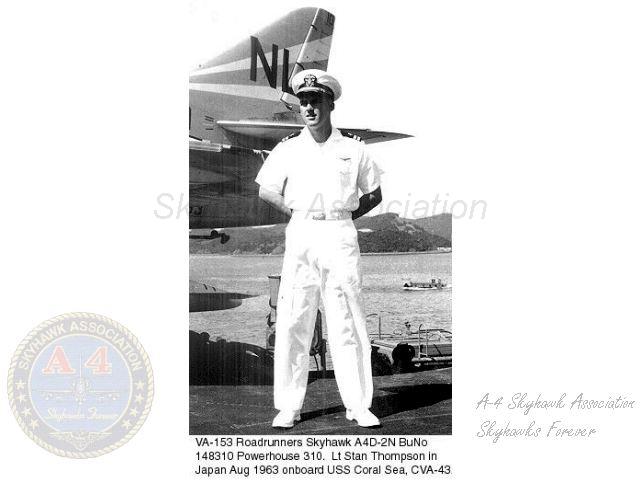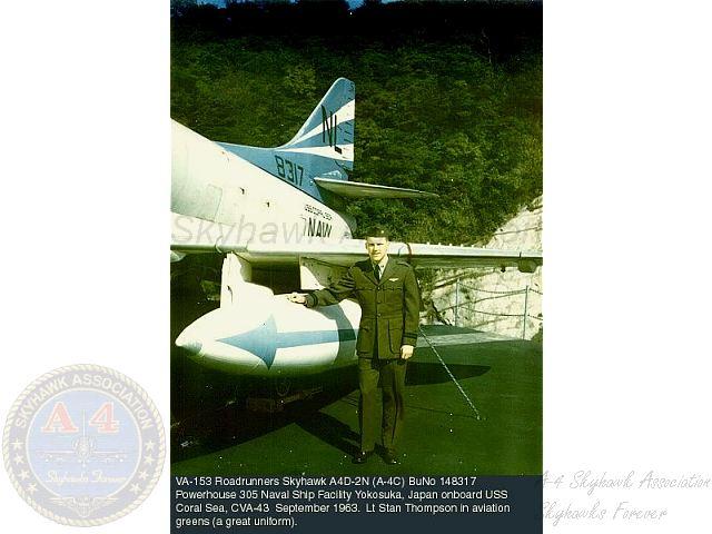Unit Photos JUL59: NAN photo of Marines working on a J-65 engine. JUL59 NAN. U.S.S. Hancock Feb. 1958 - Jan. 1960: VA-153 Blue Tail Fly A4D-1 BuNo. 142156, side number NL 303, attached to CVG-15, is ready to go on the catapult (probably on the United States Ship Hancock CV 19). USN photograph from Douglas Aircraft Company files and provided by Harry S. Gann. 1960 U.S.S. Hancock: Blue Tail Flies Skyhawk NL-301 forms the backdrop for five pilots (CDR Jack Bauman, LCDR Ralph Odgers, LT's Jim Doolittle, Tom Brown & Ben Fromm) who became Centurions during the Westpac deployment. Naval Aviation News photo. 1960-61: Blue Tail Flies Skyhawk BuNo 142923 undergoing maintenance in the hangar. Douglas. U.S.S. Coral Sea SEP 1960: A-4C BuNo. 147825, side number NL 302, attached to CAW-15 aboard the United States Ship Coral Sea CVA-43 -- is pictured on the Naval Air Station Lemoore ramp. Blue Tail Fly A-4F BuNo. 155026, side number NL 306, attached to CAW-15 aboard the United States Ship Coral Sea CVA-43 -- is pictured on the Naval Air Station Lemoore ramp. Photograph by Harry S. Gann. 1961-62: A4D-2N Skyhawk BuNo 148307 Powerhouse 307, NL-307, USS Coral Sea, CVA-43, during the 1961-62 WestPac cruise. Front row Ens. H.J. Ferris, Lt. D.H. Westbrock, LCdr. R.R. Wilson, Lt. D.D. Owens, Ltjg A.J. Salkovics, LCdr. D.L. Johnson, Ltjg G.H. Hillhouse, Ltjg S.P. Thompson and Capt. (USAF) R.R. Sparkman. Second row: Ltjg R.A. Stromberg, Lt. W.O. Bennett, Lt. J.F. McCarthy, LCdr. J.E. Russ, Cdr. J.F. Kirklighter, Cdr. W.C. May, Cdr. W.R. Horner, Lt. R.P. Klugh, Ltjg G.W. Woehrmann, Ltjg M.A. McCarthy, Ltjg L.E. Printup and Ltjg F.O. Caron. 1961-1962 A4D-2N BuNo147844, Powerhouse 300, NL-300, aboard the USS Coral Sea, CVA-43, as Lt. Salkovics does a pre-flight. Photo by Stan Thompson. 1961-62: BuNo.145077 being manned by LTJG Stan Thompson aboard CVA-43, USS Coral Sea during the 1961-62 WestPac cruise. Photo by Stan Thompson. 1961-62: A4D-2N Skyhawk BuNo.148498 Powerhouse 313, NL-313, and VA-155 Silver Foxes A4D-2 BuNo 142849, NL-606, aboard the USS Coral Sea, CVA-43, opposite VF-154 F8U-2N Crusaders BuNo 147908, NL-406, and BuNo 148659, NL-409, and VF-151 Vigilantes F3H-2 Demon BuNo 146734, NL-102, 1961-62. Photo by Stan Thompson.. 1961-62: A4D-2N Skyhawk BuNo 145087, NL-309, inflight over Japan during the 1961-62 USS Coral Sea, CVA-43, WestPac cruise. Photo by Stan Thompson. 1961-62: A4D-2N Skyhawk BuNo 145087 ...Lt. Stan Thompson's VA-153 Blue Tail Flies A4D-2N Skyhawk BuNo 145087 Powerhouse 309, NL-309, inflight during the 1961-1962 Westpac cruise. Photo by Stan Thompson. 1961-62: A4D-2N Skyhawk BuNo 145087 Powerhouse 309, NL-309, inflight over Japan during the 1961-62 USS Coral Sea, CVA-43, WestPac cruise. Photo by Stan Thompson. 1961-62: A4D-2N Skyhawk BuNo 145087, Powerhouse 309, NL-309, inflight over Japan during the 1961-62 USS Coral Sea, CVA-43, WestPac cruise. Note exchange pilot USAF Capt. Ralph Sparkman's name beneath the canopy. Photo by Stan Thompson. 1961-62: BuNo.148307 as the pilot tries to uncock the nosewheel aboard the USS Coral Sea, CVA-43during the 1961-62 WestPac cruise. Photo by Stan Thompson. 1961-62: BuNo.148308 aboard CVA-43, USS Coral Sea during the 1961-62 WestPac cruise. Photo by Stan Thompson. 1961-62: A4D-2N Skyhawks BuNo.145087, NL-309, and BuNo 147825, NL-302, in formation over Japan during the 1961-62 USS Coral Sea, CVA-43, WestPac cruise. Photo by Stan Thompson. 1961-62: A4D-2N Skyhawk BuNo 148314, NL-304, flying above Mt. Fuji while temporarily based at NAS Atsugi, 1961-62. Photo by Stan Thompson. 1961-62: A4D-2N Skyhawk BuNo 148314, NL-304, in a bank over Mt. Fuji while temporarily based at NAS Atsugi, 1961-62. Photo by Stan Thompson. 1961-62: A4D-2N Skyhawk BuNo 148314, NL-304, flying over Mt. Fuji while temporarily based at NAS Atsugi. Photo by Stan Thompson. 1961-62: A4D-2N Skyhawk BuNo 148541 Powerhouse 312, NL-312, tanker getting the starter unit (huffer) attached at NAS Atsugi, Japan while the Blue Tail Flies were temporarily based ashore during the 1961-62 WestPac cruise. Photo from Stan Thompson. 07 May 1962: A4D-2N Skyhawk BuNo 148541, Powerhouse 312, NL-312, Lt(jg) Stan Thompson, coming aboard the USS Coral Sea, CVA-43, during the 1961-62 WestPac cruise. Photo from Stan Thompson. BuNo.145077 at Subic aboard CVA-43, USS Coral. Photo by Stan Thompson. 1963-65: Naval Air Station Lemoore ramp. A row of parked VA-153 A-4E Skyhawks at Naval Air Station Lemoore. From front right to rear left: BuNo. 147718 side number NL 313; BuNo. 148481; BuNo. 148310; BuNo. 149573; BuNo. 148306. Photograph by Harry S. Gann. BuNo.147825 at NAS Lemoore. Photo by Stan Thompson. 1961-62: A4D-2N Skyhawk BuNo 147825 Powerhouse 302, NL-302, inflight over Japan during the 1961-62 USS Coral Sea, CVA-43, WestPac cruise. Photo by Stan Thompson. 1961-62: Coral Sea: BuNo.147825 traps aboard CVA-43, USS Coral. Photo from Stan Thompson. LT Stan Thompson poses next to a Crusader. Photo by Stan Thompson. April 1962 CDR Kirklighter's Farewell. Photos from Stan Thompson. LTJG Hakanson, a "Demon" Driver. Photo by Stan Thompson. LT Owens and LT Thompson at NAS Atsugi. Photo by Stan Thompson. LTJG Printup aboard the Coral Sea. Photo by Stan Thompson. 1961-62 CVA-43: LCDR Jack Russ aboard the Coral Sea. Photo by Stan Thompson. Drawing illustrating the tanking role of the Skyhawk. Photo by Stan Thompson. LT Westbrock and LT Owens prepare for a flight. Photo by Stan Thompson. Stan Thompson VA-153 photo gallery for 1961-63 cruises. Photos by Stan Thompson. Thompson Sasebo Yen exchange. SDO: Thompson VA-153 SDO. Thompson CVA-43. Thompson CVA-43. CVA-43: Thompson CVA-43. CVA-43: Thompson 4. CVA-43: Thompson CVA-43 5. CVA-43: Thompson CVA-43 6. CVA-43: Thompson CVA-43 7. CVA-43: Thompson CVA-43 8. CVA-43: Thompson CVA-43 9. CVA-43: Thompson CVA-43 10. CVA-43: Thompson CVA-43 11. CVA-43: Thompson CVA-43 12. CVA-43: Thompson CVA-43 13. CVA-43: Thompson CVA-43 14. CVA43: Thompson CVA-43 15. CVA-43: Thompson CVA-43 16. CV