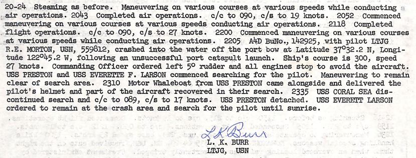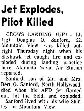 Events September 1949: Naval Air Reserve Fighter Squadron SEVEN HUNDRED EIGHTEEN (VF-718) was re-designated Fighter Squadron EIGHT HUNDRED THIRTY ONE (VF-831) at Naval Air Station New York Floyd Bennett Field. VF-718 and VF-831 both flew the Grumman F6F Hellcat. February 1, 1951: VF-831 Blue Tail Flies were called to active duty at Naval Air Station New York Floyd Bennett Field. April 1, 1951: VF-831 moved its home-port to Naval Air Station Alameda, California where the squadron transitioned into the Grumman F9F-2 Panther. September 8, 1951 to May 2, 1952: VF-831 Blue Tail; Flies flying the Grumman F9F-2 Panther under CVG-15 embarked on United States Ship Antietam CV 36 for combat over Korea. Grumman F9F-2 Panther BuNo. 125083 NL 300 is pictured on Antietam. USN Photograph. May 5, 1952: Upon return to CONUS VF-831 moved its home-port to Naval Air Station Moffett Field, California. January 24, 1953 to September 21, 1953: VF-831 flying the Grumman F9F-5 Panther under CVG-15 embarked on United States Ship Princeton CV 37 for a second combat cruise to Korea. February 4, 1953: VF-831 was re-designated Fighter Squadron ONE HUNDRED FIFTY THREE (VF-153 Blue Tail Flies) while deployed in Korean waters. August 1, 1954 to February 28, 1955: VF-153 Blue Tail Flies flying the Grumman F9F-6 Cougar under CVG-15 embarked on USS Yorktown CVA 10 for a cruise to WestPac. February 1955: Blue Tail Fly aircraft flew sorties from Yorktown in support of the evacuation of Chinese Nationalists from the Tachen Islands. December 15, 1956: VF-153 was redesignated Attack Squadron ONE HUNDRED FIFTY THREE (VA-153). The Blue Tail Flies were assigned the Douglas A4D-1 (A-4A) Skyhawk. The Squadron completed A-4A Skyhawk transition February 12, 1957. February 20, 1957: Cdr. Alexander D.C. Byers, 38, CO of VA-153 at NAS Moffett Field, was killed yesterday when his A4D (BuNo 142147) crashed into San Francisco Bay about one mile south of International Airport. The Daily Review, Hayward, CA, Thursday, Feb. 21, 1957. Cdr. Alexander D.C. Byers, 38, CO of VA-153 at NAS Moffett Field, was killed yesterday when his Skyhawk apparently developed engine trouble at a low altitude. He ejected, but the chute failed to open completely before he hit the water. He was recovered by a Coast Guard crash boat 8 minutes after his plane plunged into the water off the San Francisco International Airport. Oakland Tribune, Thursday, February 21, 1957. October 21, 1957: Lt. Robert T. Rich, 28, was killed when he crashed during a night practice bombing run at Fallon, NV. Rich was member of VA-153 at Moffet Field. Long Beach Independent, Wednesday October 23, 1957. Lt. Robert T. Rich, 28, was killed last night when his Skyhawk (BuNo 142143) crashed and exploded on a practice bombing run 10 miles SW of NAAS Fallon, NV. VA-153 was TAD to Fallon from NAS Moffett for bombing practice. The explosion was seen by Fallon residents about 9:45 p.m. Reno Gazette, Tuesday, 22 October 1957. November 21, 1957: Lt(jg). Douglas O. Sanford, 22, was killed Thursday night when his Skyhawk (BuNo 142217) jet caught fire hit the field and exploded during landing practice at Crows Landing. Redlands Daily Facts, Friday, Nov. 22, 1957. His A4D jet crashed to earth and burst into flame near Ward Ave., about three miles southwest of NALF Crows Landing on the Covell ranch about 200 feet off Ward. August 23 to September 9, 1958: The Blue Tail Flies flew sorties in the Taiwan Straits after the Chinese Communists bombarded Quemoy Island. October 27, 1958: VA-153 was assigned the Douglas A4D-2 (A-4B) Skyhawk. June 21 1959: Lt(jg). Alvin Allen was on a cross country when the Oil Pressure Flip/Flop Gauge became erratic prompting him to execute a "Precautionary Flameout Approach" to NAS Kingsville. With excessive speed the aircraft touched down 4,000 ft. down the runway, the tailhook was pulled from the aircraft, Field Arresting Gear failed, the fuselage and wing separated and caught fire off the runway end. Lt(jg). Allen was uninjured. From Jim Doolittle, VA-153 Maintenance Officer in 1959. February 15, 1960: Lt(jg). Gordon N. Blake and a housewife were killed when his VA-153 Skyhawk (BuNo 142919) hit a house on Emily Drive as he was coming in for a landing. The crash occurred a half mile from Moffett Boulevard, near NAS Moffett Field. Blake was seen to eject and to come down into the home his Skyhawk hit which, according to an eyewitness, was just an inferno. The Skyhawk glanced off the front part of the roof, crashed into a field and broke in half. The site is just south of the Bayshore highway just inside the Mountain View City line. San Mateo Times, Monday, February 15, 1960 September 8, 1960: Lt(jg). Richard E. Morton (VA-153 based at Moffett Field) was killed last night when his A4D-2 Skyhawk (BuNo 142925) plunged upside down just in front of the USS Coral Sea 115 miles NW of Santa Cruz due to insufficient airspeed on a night launch. Oakland Tribune, Friday, September 9, 1960. 2205 A4D BuNo 142925 with pilot LTJG R.E. Morton, USN, crashed into the water off the port bow at Latitude 37-32.2 N, Longitude 122-45.2 W, following an unsuccessful port catapult launch. Ship's course is 300, speed 27 knots. Commanding Officer ordered left 5 deg. rudder and all engines stop to avoid the aircraft. USS Preston and USS Everett F. Larson commenced searching for the pilot. Maneuvering to remain clear of search area. 2310 Motor Whaleboat from USS Preston came alongside and delivered the pilot's helmet and part of the aircraft recovered in their search. 2335 USS Coral Sea discontinued search and c/c to 089, c/s to 17 knots. USS Preston detached. USS Everett Larson ordered to remain at the crash area and search for the pilot until sunrise. USS Coral Sea deck log, 8 September 1960. September 19, 1960: USS Coral Sea (CVA 43), with VA-153 embarked, operated in the South China Sea after Pathet Lao forces captured strategic positions in Laos. January 6, 1961: Lt. Tom Joseph Cress was killed when his A4