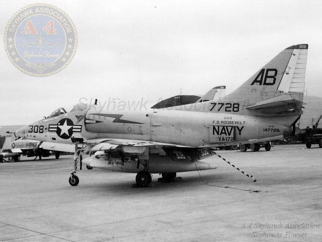 December 2, 1966: Cdr. Bruce August Nystrom, VA-172 CO, (BuNo 145143) and his wingman Ens. Paul Laurance Worrell (BuNo 145116) were killed when their aircraft were hit by SA-2 missiles or flew into the ground while on a night armed reconnaissance mission near Phuc Nhac. Ens. Worrell had been heard to warn Cdr. Nystrom that he had a SAM warning. Cdr. Nystrom told him to commence evasive action and then announced a SAM launch. Another pilot saw two flashes on the ground about 1 minute apart followed by two explosions in the air. December 18, 1966: LCdr. Ed W. Oehlbeck was wounded over North Vietnam while flying A-4C BuNo.148608. He bingoed to Da Nang and safely landed his aircraft. The a/c was returned to the ship on 12/19/1966 by Dale Content, Oehlbeck's wingman. August 24, 1967, through May 19, 1968: VA-172 flying the Douglas A-4C Skyhawk, embarked on USS Franklin D. Roosevelt CVA-42, for its eighteenth cruise. This was a tour to the Mediterranean theater. January 7, 1969, through July 29, 1969: VA-172 flying the Douglas A-4C Skyhawk, embarked on USS Shangri-La CVA 38, for its nineteenth cruise. This was a tour to the Mediterranean theater.