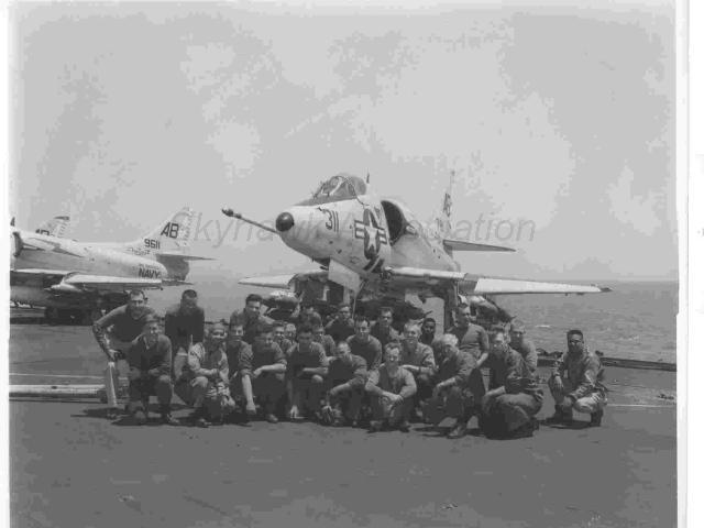Unit Photos 1958-59: Cruise Book for USS FDR - 1958-59 Med Cruise 1958-59: Commander Hank Cutler, Skipper of the BlueBolts for 1958/59 Med cruise aboard FDR. 1958-59: Richard Werkmeister (center) gets "expert" advice from Douglas Rep. John Rosen (right), and Bob Casecla of Wright Aircraft Corp. (left) who were with VA-172 during the FDR 1958//59 Med Cruise. 1958/59 Med: Boss for the moment, is LTJG Jim "Snoopy" Populorum as SDO. 1958/59 Med: 1958/59 Med: Ed Wingerter, Dick Cook, Howie Young, Herm Turk and Pat Patrick answer the call to "Man'em on the Double". 1958/59 Med: 1958/59 Med: LCDR "Dad" Young strapped in by Plane Captain Tony Whitehead. 1958/59 Med: "Hook me Up"! Blue Bolts Skyhawk AB-301 being maneuvered into position on one of the FDR's cats. Cruise book photos above from Harry Clark. 1958/59 Med: VA-172 A-4 breaks the "Holdback" as the "Cat" begins its stroke. 1958-59 Med: A-4 "leashed" to the steering bar. 1958-59: Blue Bolts Skyhawk BuNo 142758, AB-304, being maneuvered into position on the hangar deck. USS FDR 1958-59 Cruise Book via Harry Clark. 1958-59: 1958-59: BuNo 142790, AB-308, being maneuvered onto the cat. U.S.S. Franlin D Roosevelt 1958-59 Cruise Book. via Harry Clark. 1958-59: VA172 Roger Widney and Ray Waush working in the nose. USS FDR 1958-59 Cruise Book via Harry Clark. 1958-59: VA-172 "Nap" Napoli digs deep doing maintenance. USS FDR 1958-59 Cruise Book via Harry Clark. 1958-59: VA-172 James Paris is working on the radio. USS FDR 1958-59 Cruise Book via Harry Clark. 1958-59: Blue Bolts Skyhawks lined up, manned, and ready to go aboard the USS F.D. Roosevelt. BuNo 142827, AB-300 in the foreground. Cruise book photo via Harry Clark. 1958-59: Loading practice bombs on a Scooter. 1958-59: The "FDR" refueling, showing her Flight Deck. 1958-59: 1FDR's Portable Laning Mirrors. 1958-59: This scooter has had her teeth (20mm) pulled. Closer image of BuNo.142758 on #2 Cat. USS FDR 1958-1959 Cruise Book. From Harry Clark. 1958-59: In-flight formation of Blue Bolts Skyhawks: BuNo 142790, AB-308, BuNo 142758, AB-304, BuNo 142798 and unknown Skyhawk. USS FDR 1958-1959 Cruise Book. From Harry Clark. 1958-59: Blue Bolts Skyhawk BuNo 142758, AB-304, being moved into position on the cat. USS FDR 1958-1959 Cruise Book. From Harry Clark. 1958-59, maybe: BuNo.142771. Highlanders in formation: BuNo.142730 (AB-401, BuNo.142771 (AB-403) and (AB-407). 1958-59: BuNo 142790 (AB308) participating in the "Deck Shuffle". First they move me here, then they move me there. Webmaster's note: An uncommon site t this former Plane Captain, the boarding ladder laid back against the intake. A sharp application of the brakes could cause it to come forward and strike the deck hard, not to mention anyone standing there. USS FDR 1958-1959 Cruise Book. From Harry Clark. 1958-59: BuNo.142790 "Gassing Up". USS FDR 1958-1959 Cruise Book. From Harry Clark. 1958-59: BuNo142794, and two sister A4D-2s in formation during the Sept. 1958 to Aug. 1959 Med Cruise.USS FDR 1958-1959 Cruise Book. From Harry Clark. 1958-59: BuNo 142795 (A4D-2) in the hanger Bay onboard the USS Franklin D. Roosevelt during the Sept. 1958 to Aug. 1959 Med Cruise. 1958-59: 1958-59: BuNo 142795 on the Flight Deck. Webmaster's note: An uncommon site t this former Plane Captain, the boarding ladder laid back against the intake. A sharp application of the brakes could cause it to come forward and strike the deck hard, not to mention anyone standing there. USS FDR 1958-1959 Cruise Book. From Harry Clark. 1958-59: BuNo.142795 AB-305 of VA-172 being fueled by Fred Wilms and Leon Lambert. USS FDR 1958-1959 Cruise Book. From Harry Clark. 1958-59: VA-172 AB310 on the FDR Flight Deck. Bob Cole, Bob Graham, Tony Cabot and Ken Nutt are four tired "Tigers" at the end of a long day in the air. All photos from Harry Clark's Cruise Book. 1959: A-4B BuNo 142827 AB-310 Photograph from Gary Verver. A-4B having her tied-downs broken down in preparation for a move. JAN60: A pair VA-172 A4D-2 Skyhawks trying to go very slow while a pair of SPAD Tankers from VA-42 are trying to go very fast. NAN Photo. 1959-1960: "The smoking lamp is out throughout the ship while re-winding A4D's," was the word passed one fine morning by the VA-15 Valions to their cousin squadrons the VA-172 Blue Bolts and the VA-46 Clansmen aboard the USS Franklin D. Roosevelt, CVA-42. The occasion of this intra-Air Group One harassment was Operation Tinker Toy performed by the VA-15 AD-6 Skyraider prop drivers during the FDR's current deployment. Equipping the two squadrons of A4D's with a "wind-up key" was the work of VA-15's Lt. Gordon F. Udall and AMC Jesse B. Hartley. News of the day aboard the FDR was that in-flight rewinding should double the range of the A4D. Front to back VA-172 Blue Bolts A4D-2 Skyhawks AB-301, AB-307, AB-308, and VA-46 Clansmen A4D-2 AB-40x, with the auxiliary wind-up keys installed, USS Franklin D. Roosevelt, CVA-43, MED, 1959. Name below the canopy of AB-301 is Cdr. A. Barker Jr. From Jack Woodul. 1961: BuNo 142697 A4D-2 refueling VF-14 F3H Demon BuNo 145521, AB-102. Gary Verver. 1961: VA-172 Blue Bolts Skyhawks, VAH-11 Skywarrior, VF-11 Crusaders and VF-14 Demon at the top operating from the USS F.D. Roosevelt. Naval Aviation News Photo. 1961-62: Blue Bolts Skyhawk flight line. Right to left BuNo 148546, AB-301, BuNo 148554, AB-303. 1962: BuNo 149563, AB-300, parked on the ramp during an open house. Unknown photographer via W. Mutza. 1962: Blue Bolts Skyhawk BuNo 149565, AB-301, assigned to CDR W.S. Stewart parked on the ramp. Unknown photographer via W. Mutza. 1962: (L - R) BuNo 148468 AB-309, 148446, 149566 and 149566. In the background is CVA-42, USS Franklin D. Roosevelt. This was taken during the Cuban Missile Crisis. Photo from Stanley S. Martin. 1963-64: BuNo 149611 with Special Weapons Loading Team. Stanley "Marty" Martin is bottom front right, with Tim Cook second to his left. They are in front of AB-311, A-4C BuNo 147XXX. BuNo 149611 is at left. Photo