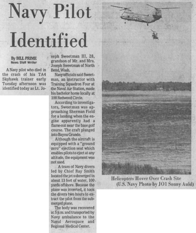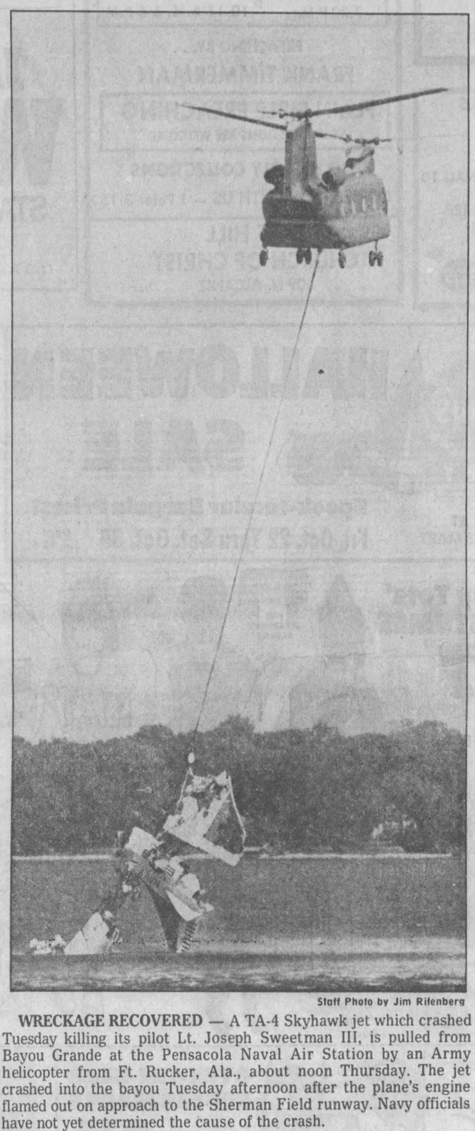 October 19, 1976: Lt. Joseph Sweetman III, age 28, VT-4 instructor pilot, was killed in the crash of his TA4 Skyhawk trainer early Tuesday afternoon. Sweetman was approaching Sherman Field for a landing when the engine apparently had a flame-out near the base golf course and plunged into Bayou Grande and came to rest 100 yards off shore inverted in 13 feet of water. The ejection seat was not used. The Pensacola News, Wednesday, 20 October 1976. A Navy pilot was killed Tuesday in a training plane when it crashed into the Bayou Grande as he started to land at NAS Pensacola. Panama City News-Herald, Wednesday, October 20, 1976. Wreckage retrieved by Army helicopter from Ft. Rucker, Pensacola News Journal, Friday, October 22, 1976. I was the Runway Duty Officer for VT-4 when this accident happened. From what I remember, the pilot was Lt. Joe Sweetman He was on a maintenance check flight and the throttle hung up at a low rpm. He attempted to return to the field using an LPA approach, but indicated that he didn't think he had the power or altitude to make it back to base. He declared an emergency with the tower, lined up for a straight in approach. When he went to drop the landing gear, the engine either reduced power or flamed out, not sure which but he transmitted his intention to eject. At that point he leveled the aircraft but couldn't eject. The aircraft impacted the water, broke apart and Joe was killed. If I remember right, there were two maintenance problems, one, the throttle linkage had become disconnected, two, the cartridge that fires to remove the canopy was incorrectly installed and never hit the firing pin. From Dan Perrine.