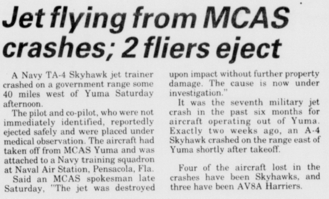 May 31, 1980: Lt. Randy J. "Dutch" Deutschendorf (IP) and W.H. Ismail (SP) ejected safely. A Navy TA-4 Skyhawk (BuNo 156910) crashed on a government range some 40 miles west of Yuma Saturday afternoon... The aircraft had taken off from MCAS Yuma and was attached to a Navy training squadron at NAS Pensacola, FL... The jet was destroyed upon impact without further property damage... It was the seventh military jet crash in the past six months for aircraft operating out of Yuma. Exactly two weeks ago, an A-4 Skyhawk crashed on the range east of Yuma shortly after takeoff. Four of the aircraft lost in the crashes have been Skyhawks, and three have been AV-8A Harriers. Yuma Daily Sun, Sunday, June 1, 1980. VT-4 TA-4J BuNo 156910 was destroyed at Yuma after aircraft was struck by ricocheting projectile during strafing run, 31 May 1980. crew ejects. Naval Safety Center via Jim Winchester. Lt Randy J. "Dutch" Deutschendorf and co-pilot ejected safely. A Navy TA-4 Skyhawk jet trainer crashed on a government range some 40 miles west of Yuma Saturday afternoon... The aircraft had taken off from MCAS Yuma and was attached to a Navy training squadron at NAS Pensacola, FL... The jet was destroyed upon impact without further property damage... It was the seventh military jet crash in the past six months for aircraft operating out of Yuma. Exactly two weeks ago, an A-4 Skyhawk crashed on the range east of Yuma shortly after takeoff. Four of the aircraft lost in the crashes have been Skyhawks, and three have been AV-8A Harriers. Yuma Daily Sun, Sunday, June 1, 1980. VT-4 TA-4J BuNo 156910 was destroyed at Yuma after aircraft was struck by ricocheting projectile during strafing run, 31 May 1980. crew ejects. Naval Safety Center via Jim Winchester. Lt Randy J. "Dutch" Deutschendorf ejected over a bombing range 40 miles west of Yuma, AZ during training. The ejection occurred at approximately 800 feet and an airspeed of 450 knots indicated. The cause of the ejection was a hit by a ricochet round that came up through the nose exiting through the canopy, with extreme wind blast causing incapacitation. "on this particular day I was flying as the Instructor Pilot with a student who was just beginning the Weapons Training portion of the Advanced Training syllabus. This day would be the first time Student Pilots would be firing live 20MM cannon rounds. As we came around the pattern setting up for our first run every aspect of the flight was normal. The Student Pilot made the turn while lowering the nose to the proper dive angle and once we pointed at the target, I cleared him to fire. At this phase of the flight the aircraft starts a 10 degree dive, accelerates from 350kts to 450kts, fires at 1,300 ft. AGL for approximately 1-2 seconds and pulls out of the dive no lower than 800 ft. It is not uncommon for the students to be a little nervous on their first strafing runs due to the high speed and low altitude requirements of the training. When we reached 1,300 ft. AGL the student began to fire and within seconds I knew experiencing "Target Fixation." With his two hands firmly on the control stick he continued to fire and there was no indication of the required pull up from the dive. With my hand loosely wrapped around the control stick I immediately started to pull back to bring the aircraft out of the dive and to this day I am not sure if it was my pull or the students pull that got the nose of the aircraft back to approximately level flight. During this entire time the student continued to fire the gun, so rounds were flying everywhere. As soon as the aircraft reached level flight, we were hit by a ricochet round that came up through the nose of the aircraft exiting through the canopy. We suddenly were sitting in a 450 kt. wind tunnel and the aircraft was shaking violently. As the Instructor pilot I was flying in the rear seat and due to the extreme wind blast I was incapacitated for the most part. Some of the broken glass from the canopy came flying back fracturing my visor and the wind force slammed my head against the seat rest with such force that my helmet suffered a 6-8 inch crack up the back. I initially tried to open my eyes to see if there was a chance of flying the aircraft but quickly realized that was not an option. My oxygen mask was gone, I could not breathe, my arms were pinned against the seat back and it was readily apparent we had to get out of the aircraft. Unable to reach the upper ejection handle due to the wind force I quickly realized my only option was the lower handle - - I grabbed it with both hands and gave it a strong pull (as the Instructor Pilot I had command ejection of both seats). The next thing I remember is I was approximately 600 ft. above the desert hanging in my parachute. I quickly looked around to hopefully see the Student Pilot hanging from his parachute and he was. After safely landing I quickly disconnected from my chute and started a slow jog to to find the student that was approximately 150 yards away. When I arrived he was unconscious and I could tell he had broken one of his arms, fractured his femur and I would later find that he had a third fracture in his neck. The neck injury prevented him from returning to flight status. Amazingly, I had no broken bones; I had a few cuts on my face and neck, a nasty headache and within a couple of hours I was extremely sore from muscle spasms and bruising. Approximately 3-4 days after the accident I was cleared back to flight status. It did take me 6-8 weeks to fully recover from the severe bruising muscle spasms I was experiencing as a result of the high speed ejection. In closing the Navy made a significant change to the Weapons Training Syllabus after the accident. On our flight we strafed the bullseye of the bombing target as opposed to strafing a raked designated strafing target. Bombing ranges are full of metal debris which greatly increases the potential for ricochets. I remember questioning this procedure when being ch