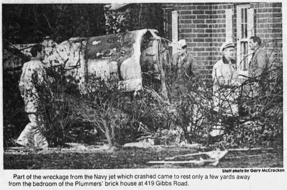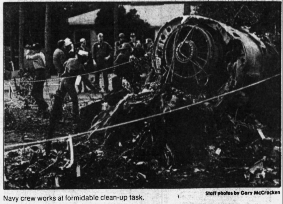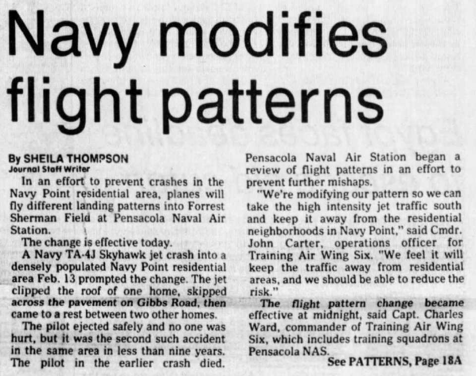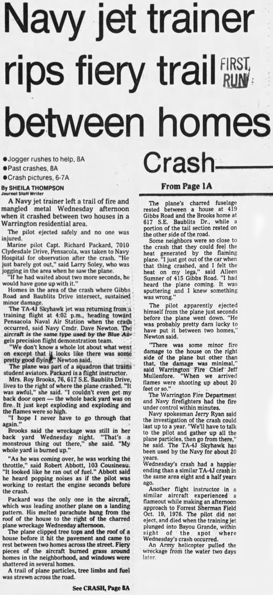 February 14, 1985: Capt. Richard Packard, 33, (IP) ejected just seconds before his TA-4J Skyhawk (BuNo 158483) clipped tree tops and the roof of a house and crashed between two houses at 4:02 p.m. Wednesday. The Skyhawk was returning to NAS Pensacola from a training flight  and was leading another plane in a landing pattern. A witness reported popping noises as if the pilot was working to restart the engine seconds before the crash. Homes in the area of Gibbs Rd. and Baublits Dr. intersect sustained minor damage. Pensacola News Journal, Thursday, 14 February 1985. Part of the wreckage from the Navy jet which crashed came to rest only a few yards away from the bedroom of the Plummer's brick house at 419 Gibbs Road. Pensacola News Journal, Thursday, 14 February 1985. Staff photo by Gary McCracken. Navy crews work at formidable clean-up task. Pensacola News Journal, Friday, February 15, 1985. Staff photo by Gary McCracken. According to Cdr. John Carter, Ops officer for TW-6, planes will fly different landing patterns into Forrest Sherman Field at NAS Pensacola in an effort to prevent crashes in the Navy Point residential area. A Navy TA-4J Skyhawk crash into a densely populated Navy Point residential area Feb. 13 prompted the change. The pilot ejected safely, but it was the second crash in the same area in less than nine years. Pensacola News Journal, Friday, March 1, 1985. VT-4 TA-4J BuNo 158483 was destroyed at Pensacola when aircraft crashed into the ground on downwind leg. 13 February 1985. Pilot ejected. Naval Safety Center via Jim Winchester.