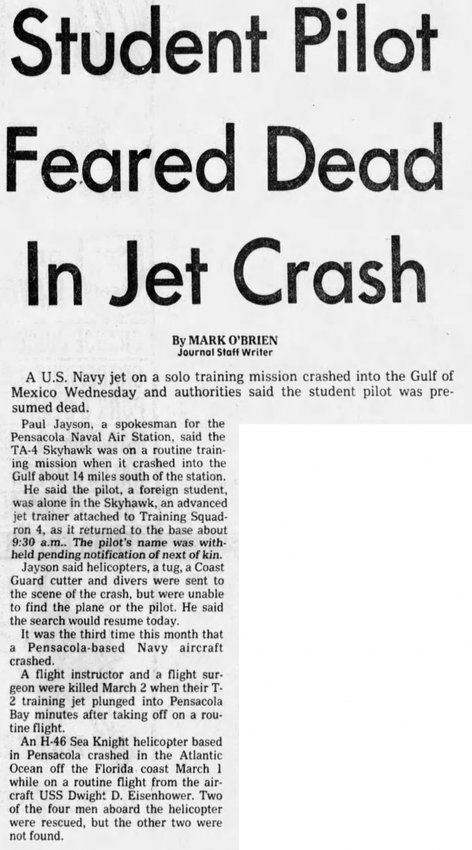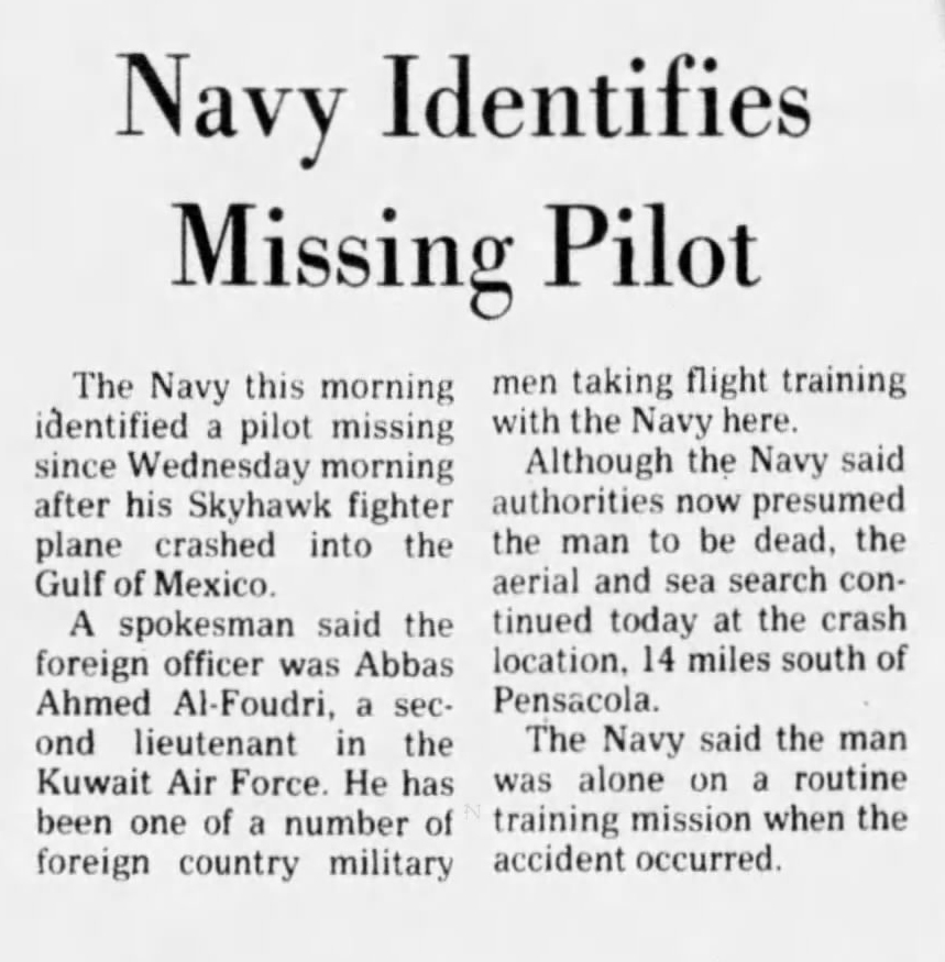 March 29, 1978: Lt. Abbas Al-Foudari. A U.S. Navy TA-4 Skyhawk (BuNo 158517)on a routine solo training mission crashed into the Gulf of Mexico Wednesday about 14 miles south of NAS Pensacola. The pilot, a foreign student, was alone in the VT-4 Skyhawk as it returned to the base about 9:30 a.m. and is presumed dead. Pensacola New Journal, Thursday, 30 March 1978. The Navy identified a pilot missing since Wednesday morning as Abbas Ahmed Al-Foudri, a 2nd Lt. in the Kuwati Air Force. Although the Navy said he is presumed to be dead the aerial and sea search continued at the crash site 14 mile south of Pensacola. Pensacola New Journal, Thursday, 30 March 1978. VT-4 lost an A-4 late 1977 or early 1978 when a Kuwait Student ejected after an instructor in another aircraft called for him to eject passing 10k feet during an ACM training flight. Neither pilot nor aircraft were recovered.  Don't remember any data on the date or aircraft number. From Dan Perrine.