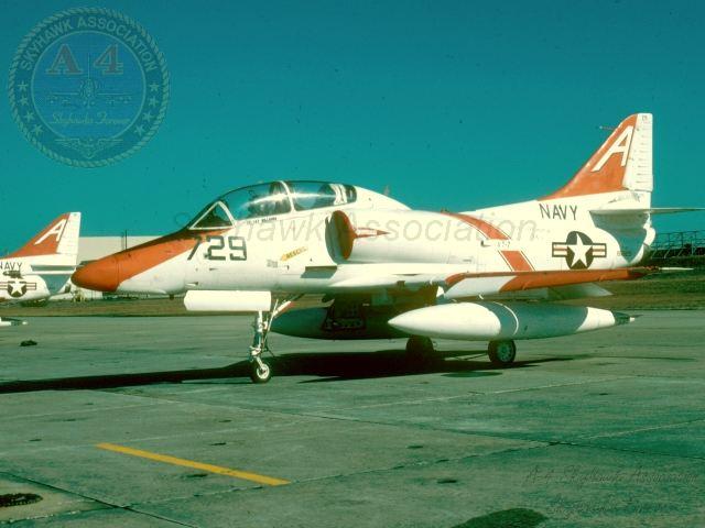 Unit Photos 1962: VT-7 Officers at Kingsville, left to right: Vt-7 Commanding Officer, Maintenance Officer and a VT-7 flight instructor Captain Rutledge, USMC. 1972: VT-7 Carrier Qualifications March 1972 on the USS Lexington CVA-16. This picture was taken looking down from the Lexington island upon 716 performing the very first VT-7 Eagle TA-4J touch and go landing, April 6, 1972. The Student Naval Aviator was First Lieutenant K. D. Ernst, USMC. The Landing Signal Officer (LSO) for this qual period was Lieutenant Bob Bush, USN. Lieutenant K. D. Ernst, USMC was a member of VT-7's first TA-4J Advanced Syallabus graduating class. VT-7 Eagle TA-4J Skyhawk 2K 716. 1972 photograph by Commander Lee Goewey, USN. VT-7 Eagle TA-4J Skyhawk 2K 716.Pic 2. VT-7 Eagle TA-4J Skyhawk 2K 744 BuNo. 158073 This picture was taken looking from the Lexington island upon Grey Oak 744 spotted for refueling. The Landing Signal Officer (LSO) for this qual period was Lieutenant Bob Bush, USN. 1972 photograph by Commander Lee Goewey, USN. 1972: VT-7 Eagle TA-4J Skyhawk 2K 737. This picture was taken looking from the Lexington island upon 2K 737 catching a two wire. The Student Naval Aviator, Ensign Waddell, USN catches a two-wire for his first trap and is on his way to carrier qualifing and his Wings of Gold. The Landing Signal Officer (LSO) was Lieutenant Bob Bush, USN. Ensign Waddell was a member of VT-7's first TA-4J Advanced Syllabus graduating class. 1972 photograph by Commander Lee Goewey, USN. 1974: 1974: Eagles Skyhawk BuNo 158141, 2K-736, parked on the ramp next to BuNo 158479, 2K-751. Unknown via W. Mutza. BuNo 158479, A-730, TA-4J parked next to an A-6 Intruder. Gary Verver Collection. BuNo 158523, A-731, parked with drop tanks. Gary Verver Collection. 1974: Left side partial tail section view of Eagles Skyhawk BuNo 158479, 2K-751, parked on the flight line next to BuNo 158141, 2K-736. Unknown via W. Mutza. 1974: VT-7 Skyhawk Over The E Boat Round-down. "Wheels down, flaps down, hook down, harness locked, brakes pumped firm, fuel 1200 pounds, roger ball." VT-7, TA-4J, side number A-759, landing aboard USS Enterprise CVAN-65. Photograph taken May 13, 1974 by Harry S. Gann. 15JUN74: VT-7 TA-4J BuNo 158477, 2K-701, dated 15 June 1974. Gary Verver Collection. AUG74: BuNo 158468, A-760, parked. Gary Verver Collection. 20JUL75: Left side view of VT-7 Eagles TA-4J Skyhawk BuNo 158097, A-700, on the ramp at NAS Meridian. Name below the canopy rail is CAPT C Ray Smith and on the fuselage COMTRAWING 1. Photo by P. Stevens. 20JUL75: Left front view of VT-7 Eagles TA-4J Skyhawk BuNo 158125, A-725, on the ramp at NAS Meridian with a pair of wing tanks. At left is the tail of VT-7 BuNo 158129, A-729. Photo by P. Stevens. 1975 VT-7 TA-4J Skyhawk FCLP Bounce: VT-7, TA-4J, side number A-701, FCLP (field carrier landing practice) bouncing at OLF (out lying field) Bravo. OLF Bravo is located 30 miles northwest of Navy Meridian. Photograph taken September 1975 by Harry S. Gann. 1975: VT-7 CAG TA-4J Skyhawk BuNo. 158097. VT-7 TA-4J BuNo. 158097, side number A-700, Commander Training Wing One. Photograph taken September 25, 1975 by Harry S. Gann. 1975: VT-7 Skyhawk BuNo. 158097 GOING DOWN!. VT-7, TA-4J, BuNo. 158097, side number A-700, Commander Training Wing One Skyhawk in a vertical dive. Photograph taken September 25, 1975 by Harry S. Gann. 1975: VT-7 TA-4J Skyhawk FCLP Bounce. VT-7, TA-4J, side number A-701, FCLP (field carrier landing practice) bouncing at OLF (out lying field) Bravo. OLF Bravo is located 30 miles northwest of Navy Meridian. Photograph taken September 1975 by Harry S. Gann. Dec 1975: BuNo 158141, A-736 parked on the ramp. Photo by R.E. Kling, G. Verver collection. 1976: BuNo.158130, VT-7 Side No.776 on the Tarmac in Bi-Centennial colors, 1976. Photograph from Harry S. Gann's collection. 1976: BuNo.158130, VT-7 Side No.776 fly by in Bi-Centennial colors. Photograph from Harry S. Gann's collection. June 1976: VT-7 Eagles TA-4J Skyhawk BuNo 158130, A-776, in the ramp in its Bicentennial paint scheme. Photographer unknown. 11JUL76: Left rear view of VT-7 Eagles TA-4J Skyhawk BuNo 158130, B-776, on the ramp in its Bicentennial paint scheme, Offutt AFB, 11 July 1976. Copyright R.W. Harrison. 03OCT76: Right rear view of VT-7 Eagles TA-4J Skyhawk BuNo 158115, A-715, on the ramp at NAS Meridian with a pair of drop tanks. Photographer unknown. 03OCT76: Right side view of VT-7 Eagles TA-4J Skyhawk BuNo 158124, A-724, on the ramp at NAS Meridian with a pair of wing tanks. Photographer unknown. 03OCT76: Right side view of VT-7 Eagles TA-4J Skyhawk BuNo 158133, A-700, COMTRAWING 1, on the ramp at NAS Meridian with a pair of wing tanks. Photographer unknown. 03OCT76: Right side view of VT-7 Eagles TA-4J Skyhawk BuNo 158129, A-729, on the ramp at NAS Meridian with a pair of wing tanks. Photographer unknown. 03OCT76: Right front view of VT-7 Eagles TA-4J Skyhawk BuNo 158138, A-734, on the ramp at NAS Meridian with a pair of wing tanks. The TA-4J at right is A-733 and could be BuNo 158467. Photographer unknown. 03OCT76: Right side view of VT-7 Eagles TA-4J Skyhawk BuNo 158466, A-727, on the ramp with a pair of wing tanks at NAS Meridian. VT-7 TA-4J in the background is A-737. Photographer unknown. 1976: BuNo 158117, TA-4J A-717, parked with boarding ladder ready. Gary Verver Collection. 15OCT77: Right side view of VT-7 Eagles TA-4J Skyhawk BuNo 158125, A-725, on the ramp at NAS North Island with a pair of wing tanks. Photographer unknown. 22 APR 1978: Eagles Skyhawk BuNo 155109, A-709, assigned to LCDR Hoffman parked on the NAS Meridian flight line. G. Verver collection via R. Dowers. 22 APR 1978: Eagles Skyhawk BuNo 156932, A-727, assigned to CAPT Vitorny parked on the flight-line. Right side view of VT-7 Eagles TA-4J Skyhawk BuNo 156932, A-727, on the flight-line next to VT-7 TA-4J BuNo 150144, A-740, NAS Meridian, 22 April 1978. Name below the canopy is CAPT Vitorny. At left is a TA-4J with Navy on the fuselage over th