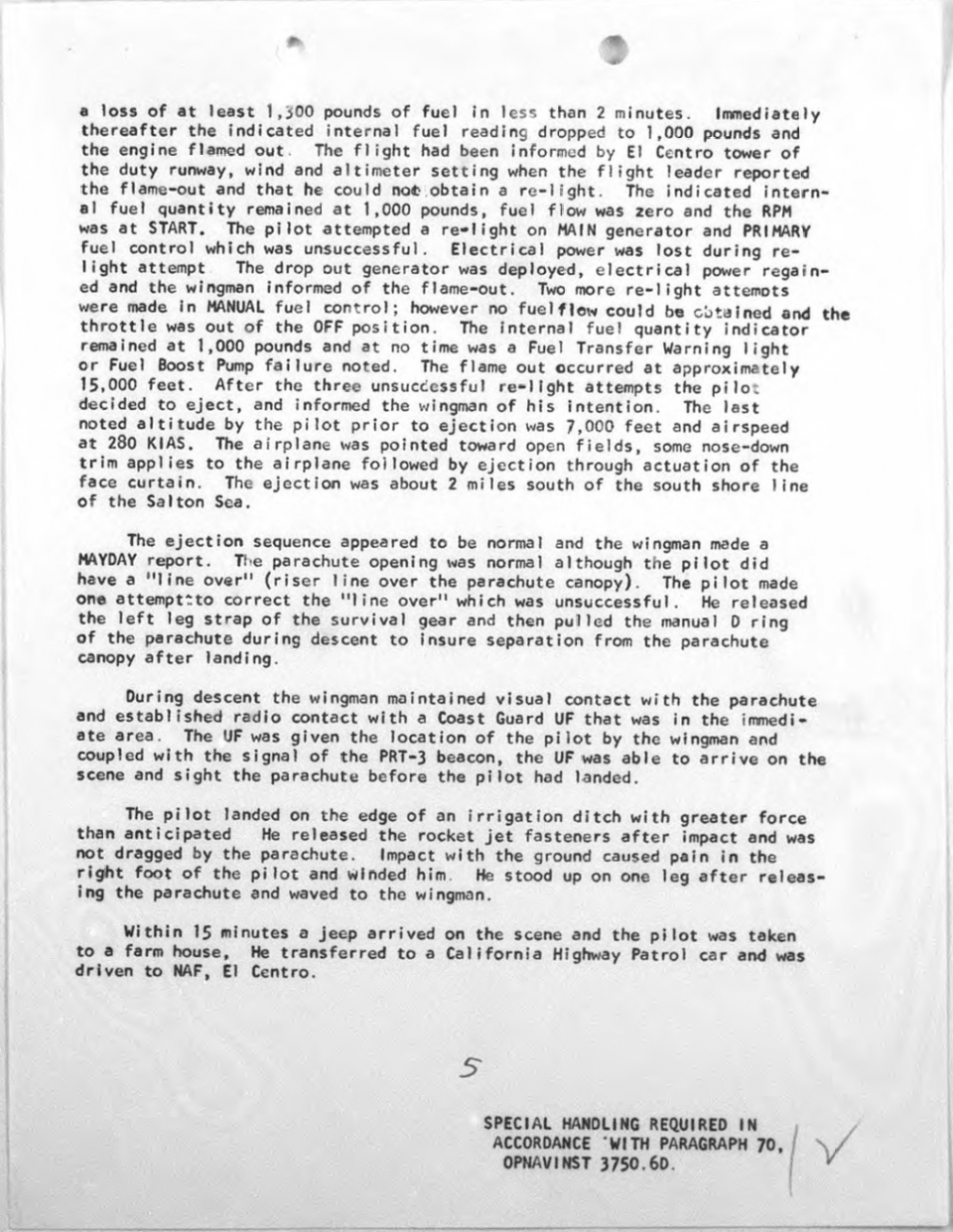 September 25, 1962: Cdr. Shelley B. Pittman, 40, ejected safely when his A4D flamed out during maneuvers over the Salton Sea Gunnery Range yesterday. The wreckage fell in an open field about three miles NW of Westmoreland, one mile from U.S. 99. The Pasadena Independent, Wednesday, 26 September 1962. Cdr. Shelley B. Pittman, 40, VX-5 Weapons Officer ejected safely from A4D-2N BuNo 145066, Mystify 2, after the fuselage fuel cell ruptured and the engine flamed out. The flight mission called for glide bombing on target 103A in the vicinity of NAF El Centro, CA, and on target "Candid Camera" near Yuma, AZ. As Mystify 2 accompanied by Mystify 8 passed 5 miles to the east of Thermal Vortac Mystify 8 noticed fuel streaming from the lead at 1345 PDT. Further examination noted it was streaming heavily from the centerline bomb rack and stbd wing root. At that time Mystify 2 reported 6,700 lbs. of fuel. The flight commenced descent to get below the scattered clouds in the El Centro area that had a base of 6,000 feet. They contacted El Centro tower and at that time Mystify 2 reported 4,000 lbs. of fuel, a loss of 1,300 lbs. in less than 2 minutes. Immediately thereafter the fuel reading dropped to 1,000 lbs. and the engine flamed out at about 15,000 feet. After three unsuccessful relight attempts the pilot decided to eject. The aircraft crashed about 1.5 miles S. of the south shore of the Salton Sea and 1 one mile east of U.S. 99. USCG UF-1G Albatross c/n G-307, USAF s/n 51-7226, USCG s/n 7226 supported the rescue as did VX-5 A4D-2N Skyhawk BuNo 145112, Mystify 8. AAR (page 11, page 12, page 13,) 25 September 1962. October 14, 1965: February 9, 1970: Maj. Jerry N. Hoblit (USAF) ejected safely after a ZAP rocket hung up in the canister and FODed the engine when it blew up during ripple fire of four rockets during a flight over B Range, NAF China Lake, CA. Jerry ejected and landed in a lava flow -- but fortunately he "found" a small patch of sand and avoided being shredded upon landing. From Raymond H. Clary Jr. |